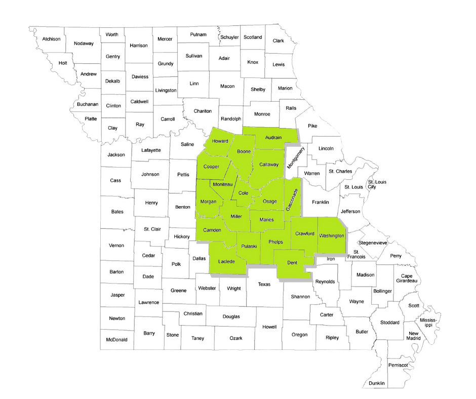 The Central Workforce Development Region spans 19 counties in mid-Missouri. Their services reach communities in Audrain, Boone, Callaway, Camden, Cole, Cooper, Crawford, Dent, Gasconade, Howard, Laclede, Maries, Miller, Moniteau, Morgan, Osage, Phelps, Pulaski, and Washington.